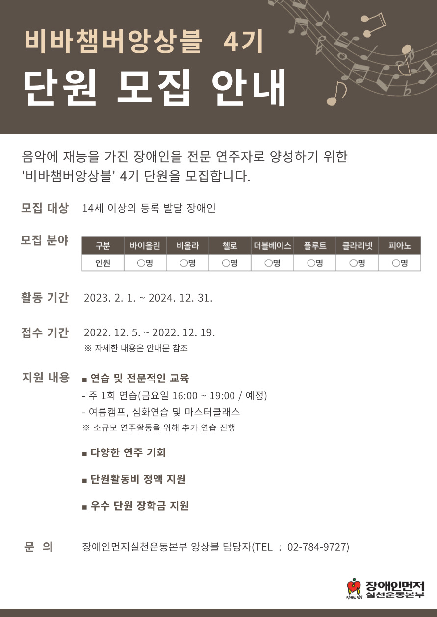 À½¾Ç¿¡ Àç´ÉÀ» °¡Áø Àå¾ÖÀÎÀ» Àü¹® ¿¬ÁÖÀÚ·Î ¾ç¼ºÇϱâ À§ÇÑ ¡®ºñ¹Ùè¹ö¾Ó»óºí¡¯ 4±â ´Ü¿øÀ» ¸ðÁýÇÕ´Ï´Ù.